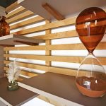 Mobilier pool-house avec 1 bar, habillage mur avec tasseaux et étagères, 3 luminaires suspendus avec tasseaux de bois