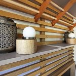 Mobilier pool-house avec 1 bar, habillage mur avec tasseaux et étagères, 3 luminaires suspendus avec tasseaux de bois