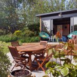 Une terrasse de 4 mètres de large et 1,20 m de profondeur, en lames de bois autoclavées brun classe 3 avec luminaire