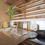 Mobilier pool-house avec 1 bar, habillage mur avec tasseaux et étagères, 3 luminaires suspendus avec tasseaux de bois