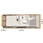 Plusieurs aménagements sont disponibles pour ce produit : Roulotte vide, bureau, salle de bain, cuisine et chambre